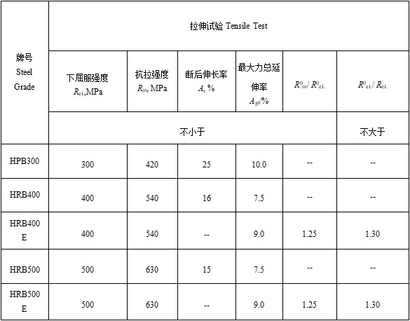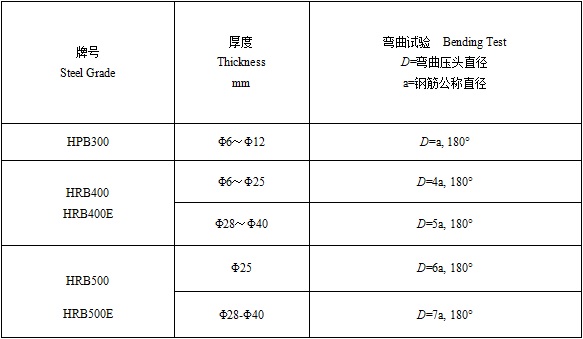 注:对牌号带E的钢筋应进行反向弯曲试验,反向弯曲试验的弯曲压头直径比弯曲试验相应增加一个钢筋公称直径。