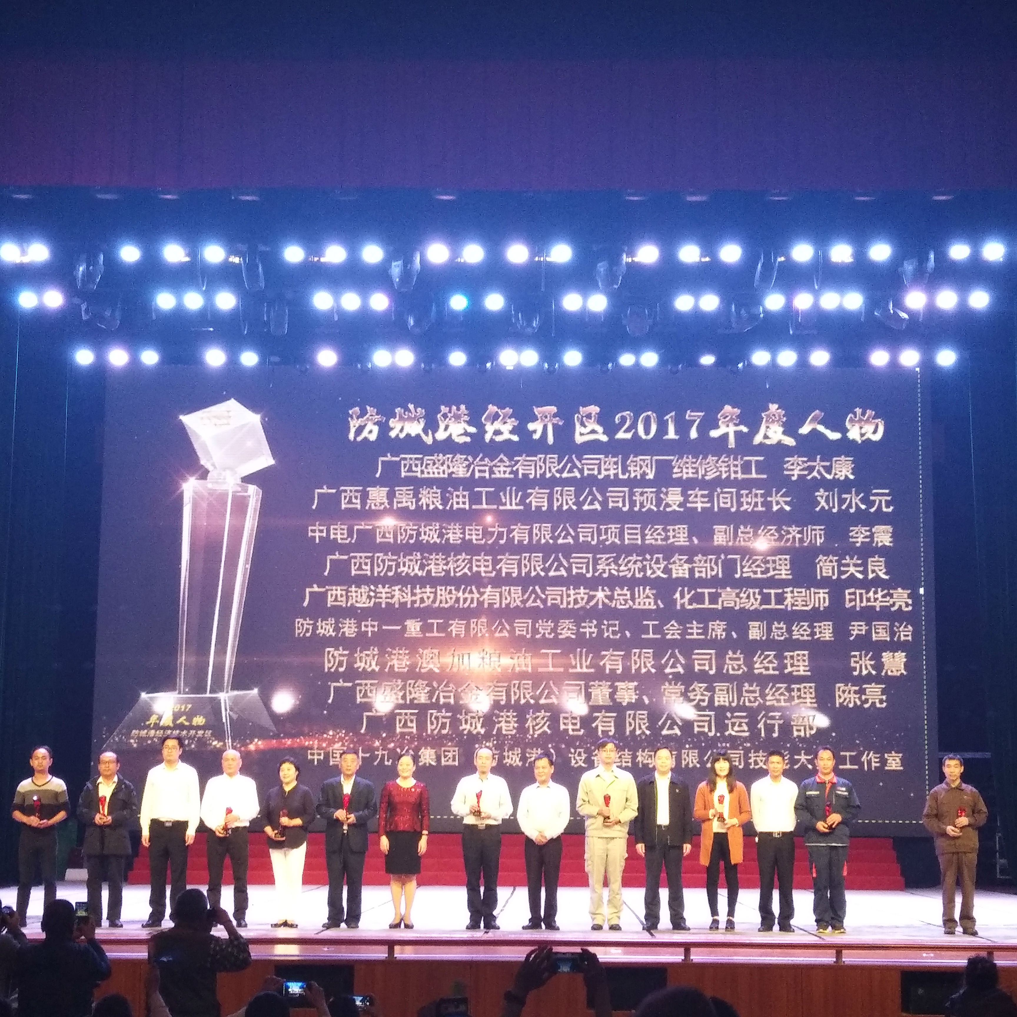 3月17日晚上八点,由防城港市总工会、防城港市经开区管委联合主办的防城港经开区2018年企业职工联谊晚会在市文化艺术中心隆重举行,市政府副市长姜明、市政协副主席林兴等19位市领导出席晚会并为获奖企业和个人颁奖。